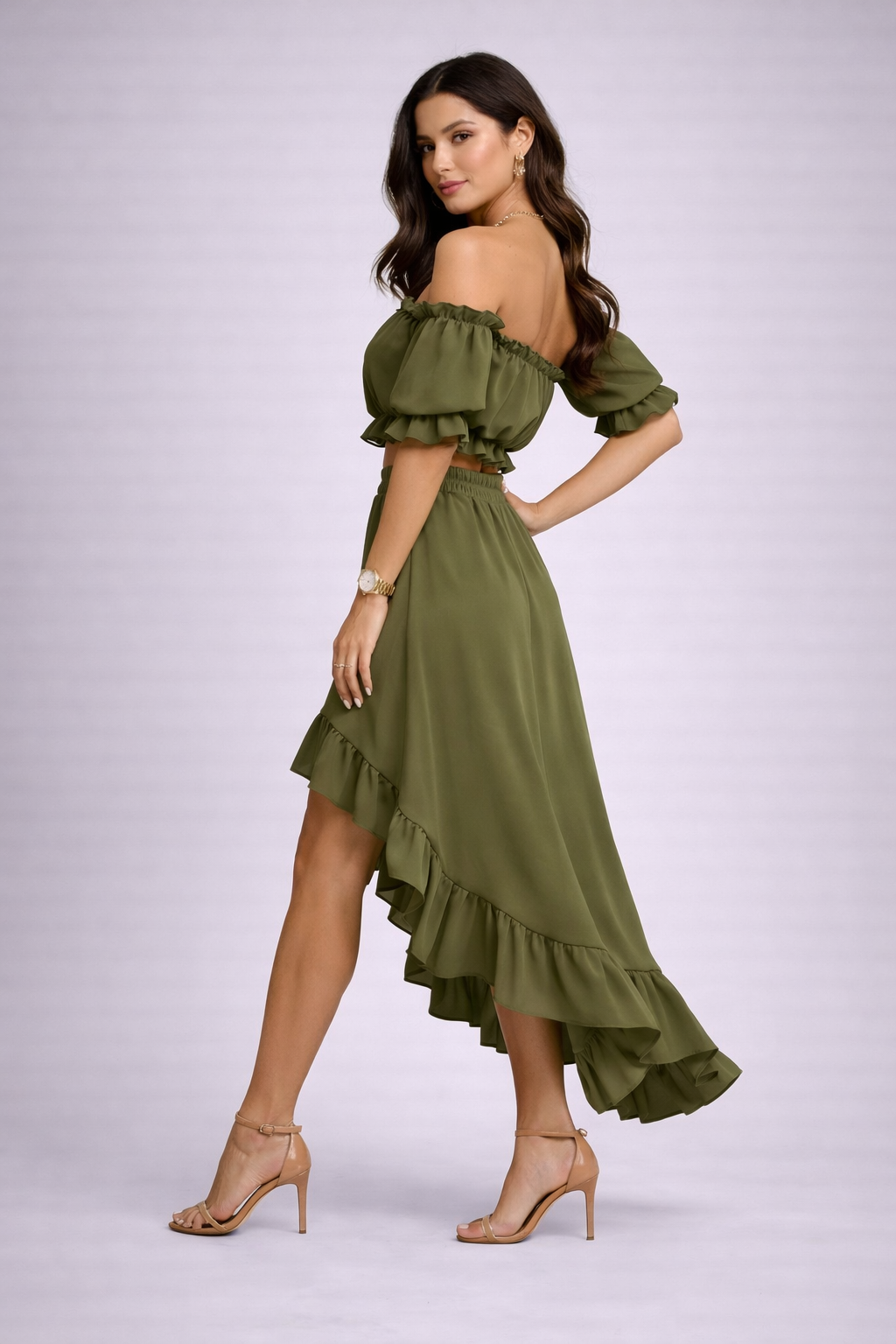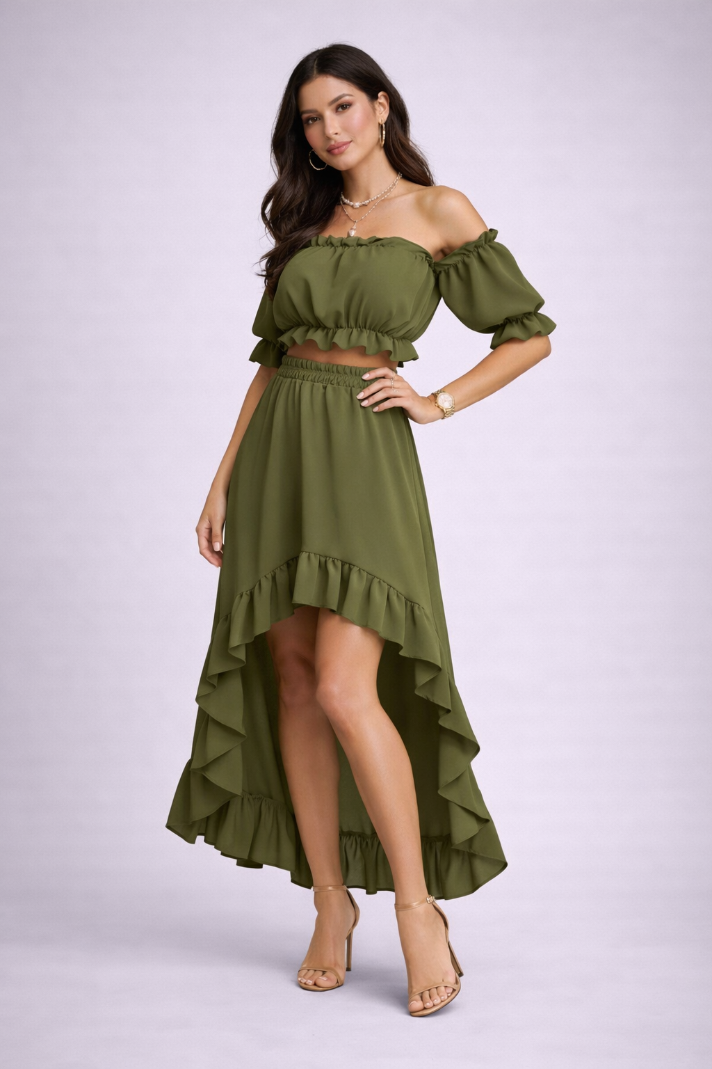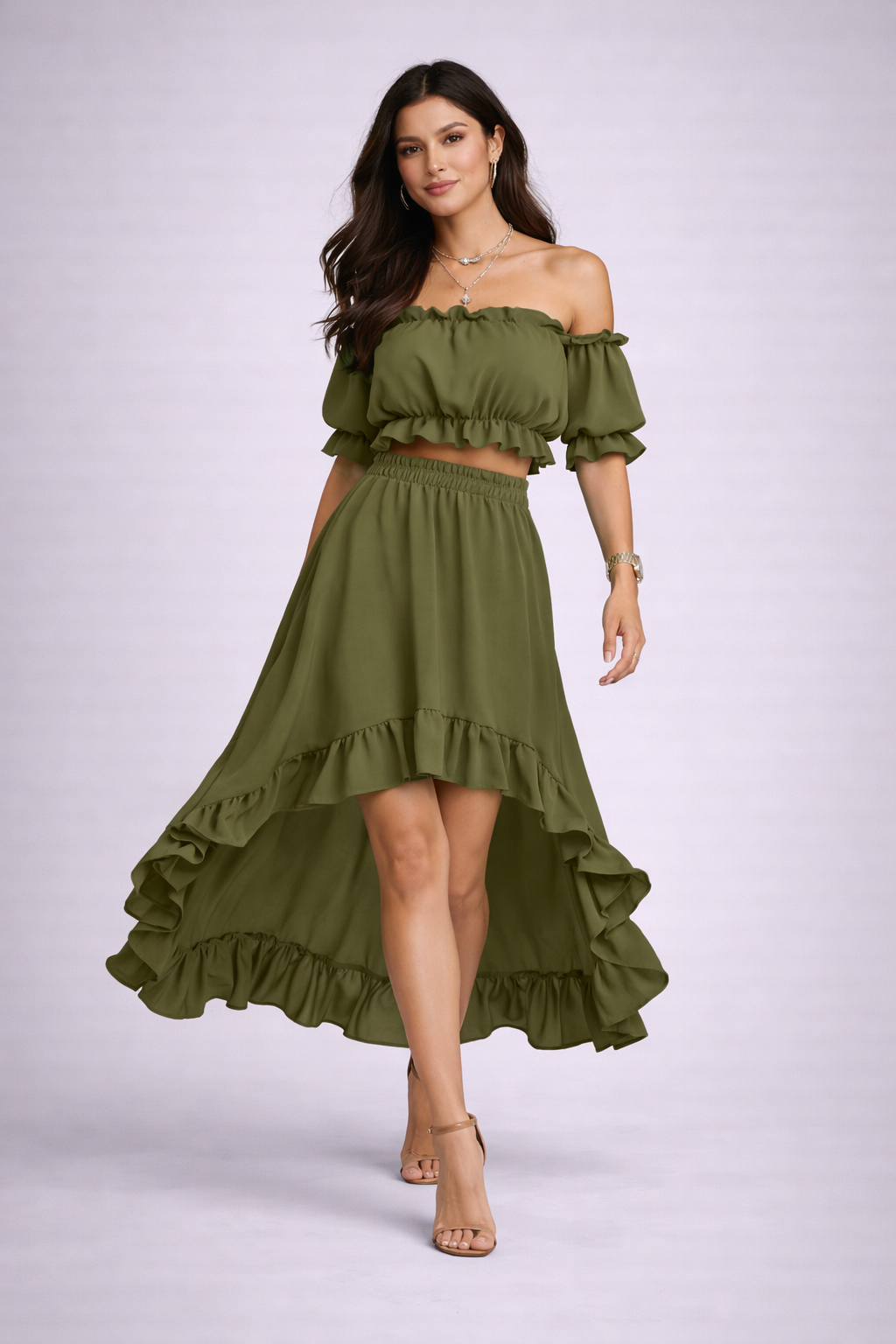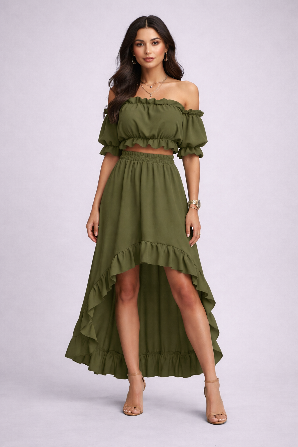 Conjunto de dos piezas con diseño fluido y femenino que estiliza la silueta de forma natural y sin esfuerzo. El top tipo bandeau con hombros descubiertos realza la parte superior, mientras que la falda asimétrica con volantes aporta movimiento y un acabado elegante.